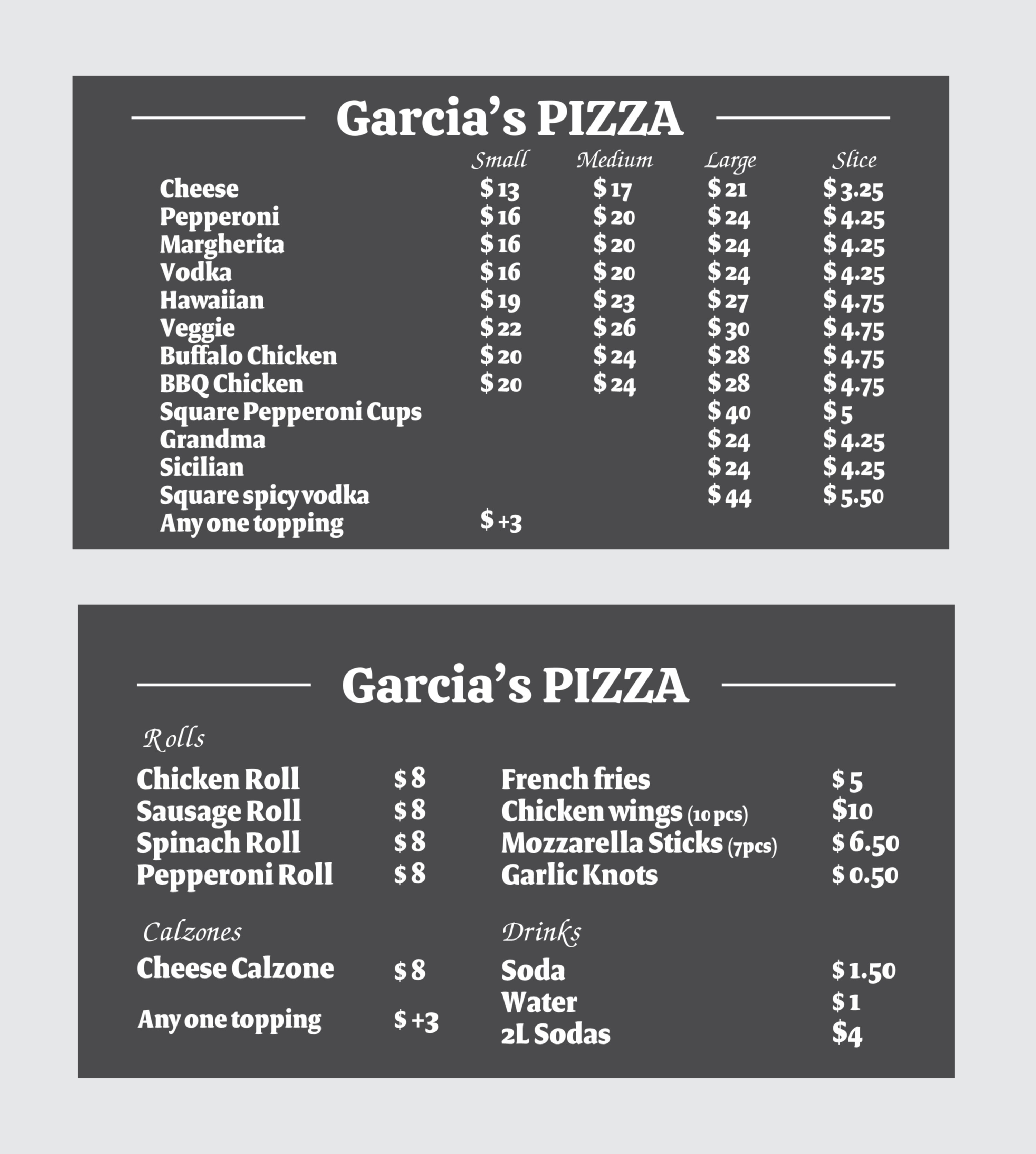 Mon: 10:00 AM - 10:00 PMCopyright © 2026 Garcia's Pizza All Rights Reserved. Sitemap. Accessibility Statement